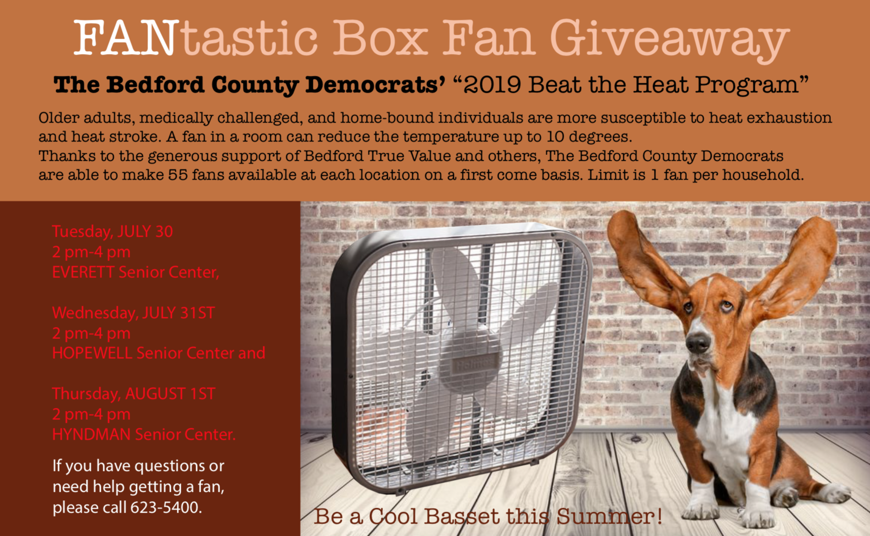Last summer, Bedford County Democrats provided a total of 177 fans, at no cost, to seniors and families in need. Thanks to all who donated and Bedford True Value for making this possible.