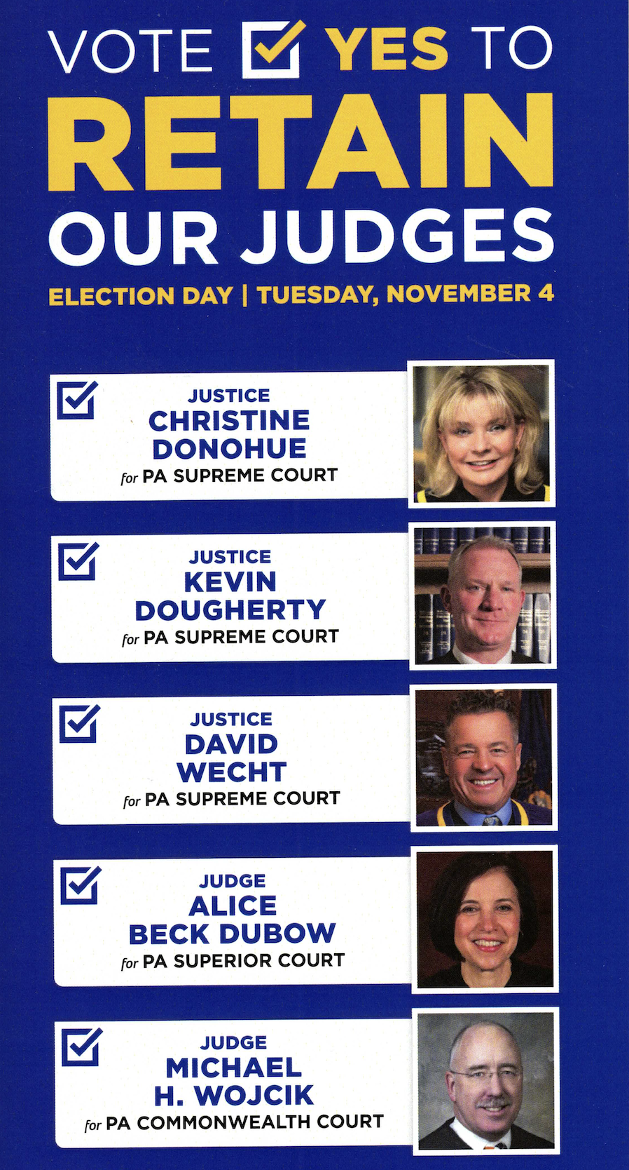 We will elect two judges to the Superior Court. Democrats Jill Beck and Timika Lane both earned highly qualified ratings from the PA Bar. The two Republican opponents were rated qualified and not recommended for failure to participate.
