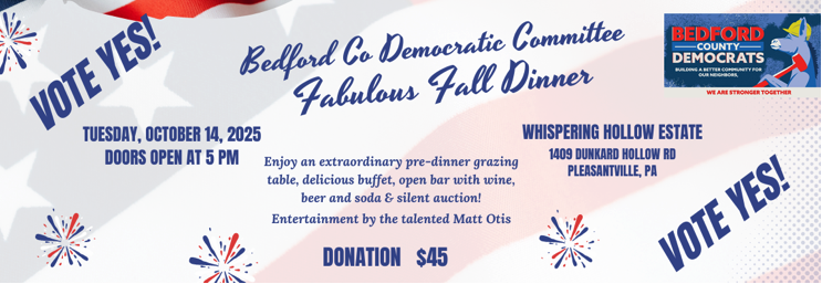 Our Fall Dinner is Tuesday, October 14 at Whispering Hollow Estates, between Pleasantville and New Paris (Directions). At this time Pennsylvania Supreme Court Justice, Christine Donohue and Chair of the Pennsylvania Democratic Party, Eugene DePasquale are scheduled to speak. Eugene was also our candidate for Attorney General in 2024.